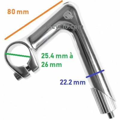 Composée d’aluminium anodisé, cette potence plongeur est compatible avec les fourches à pivot fileté de 25,4 mm de diamètre externe, soit 1″. Son inclinaison est de 18° pour une longueur de 80 mm. La potence est compatible avec les cintres de diamètre compris entre 25,4 mm et 26 mm. Son hauteur est de 130 cm. Elle est adaptée pour les guidons droit ou piste comme le guidon Track Drop de BLB.