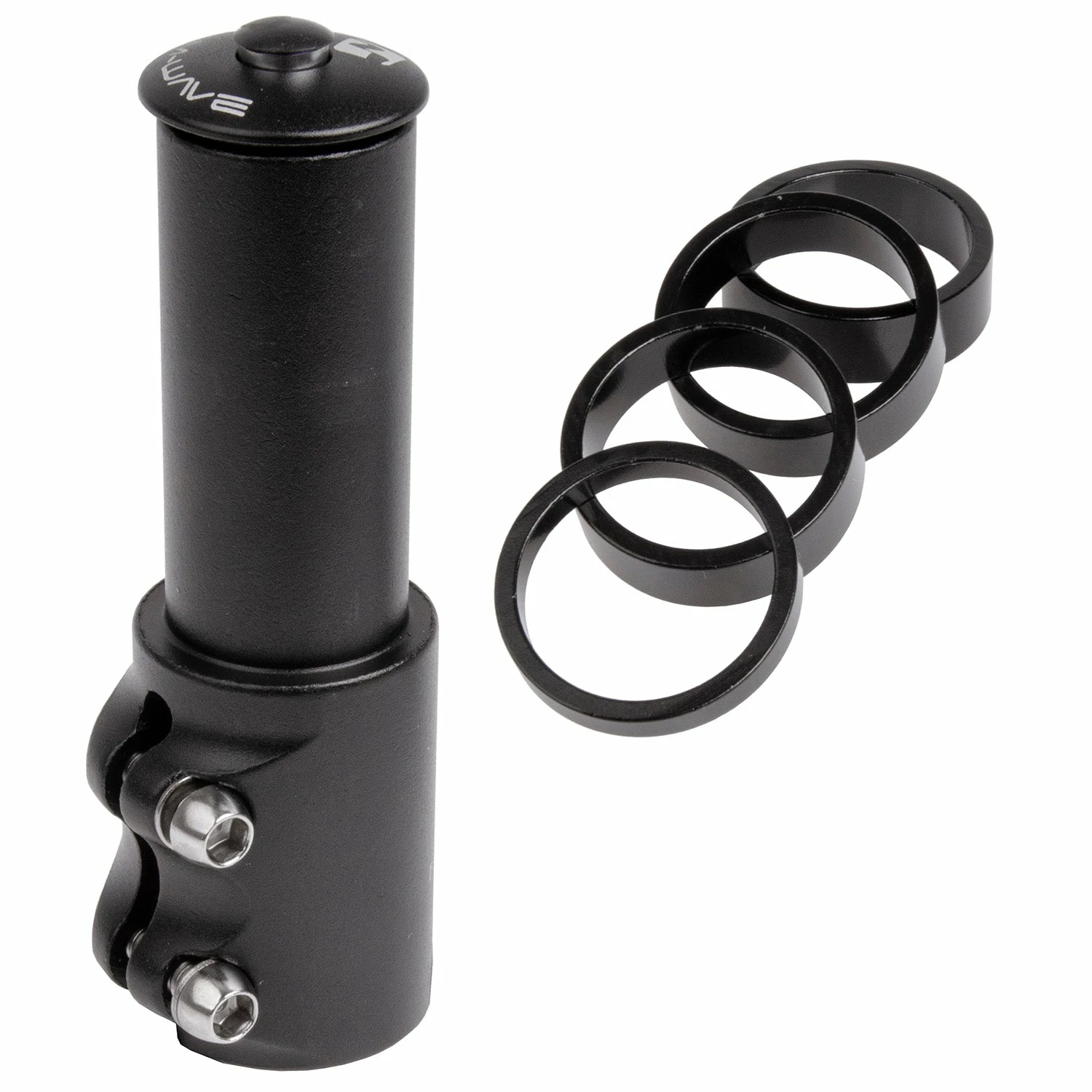 D’abord, l’adaptateur pour hauteur de potence ahead se place sur le tube de direction de 1′ 1/8″ (équivalent à 28.6 mm) de diamètre externe. L’attache prend 50 mm de haut, veillez à bien resserrer les deux vis par la suite. Fixez-y ensuite une potence aheadset compatible, donc de 1 1/8″, comme la potence aheadset 1 1/8″ Zoom. Puis ajustez votre montage avec une ou plusieurs entretoises fournies, en fonction de votre besoin. Chacune des 4 entretoises a une hauteur différente.